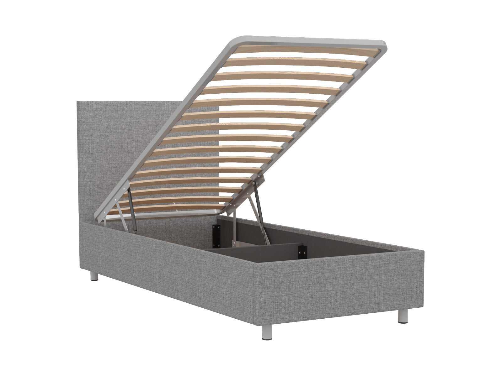Кровать оснащена основанием с подъемным механизмом, под которым располагается бельевой ящик глубиной 16 см. Рекомендуемая высота матраса от 13 см, вес матраса до 50 кг. Чехлы на царгах несъемные. Высота/толщина царг: 28 см / 4 см (средняя), 2 см - (боковые).