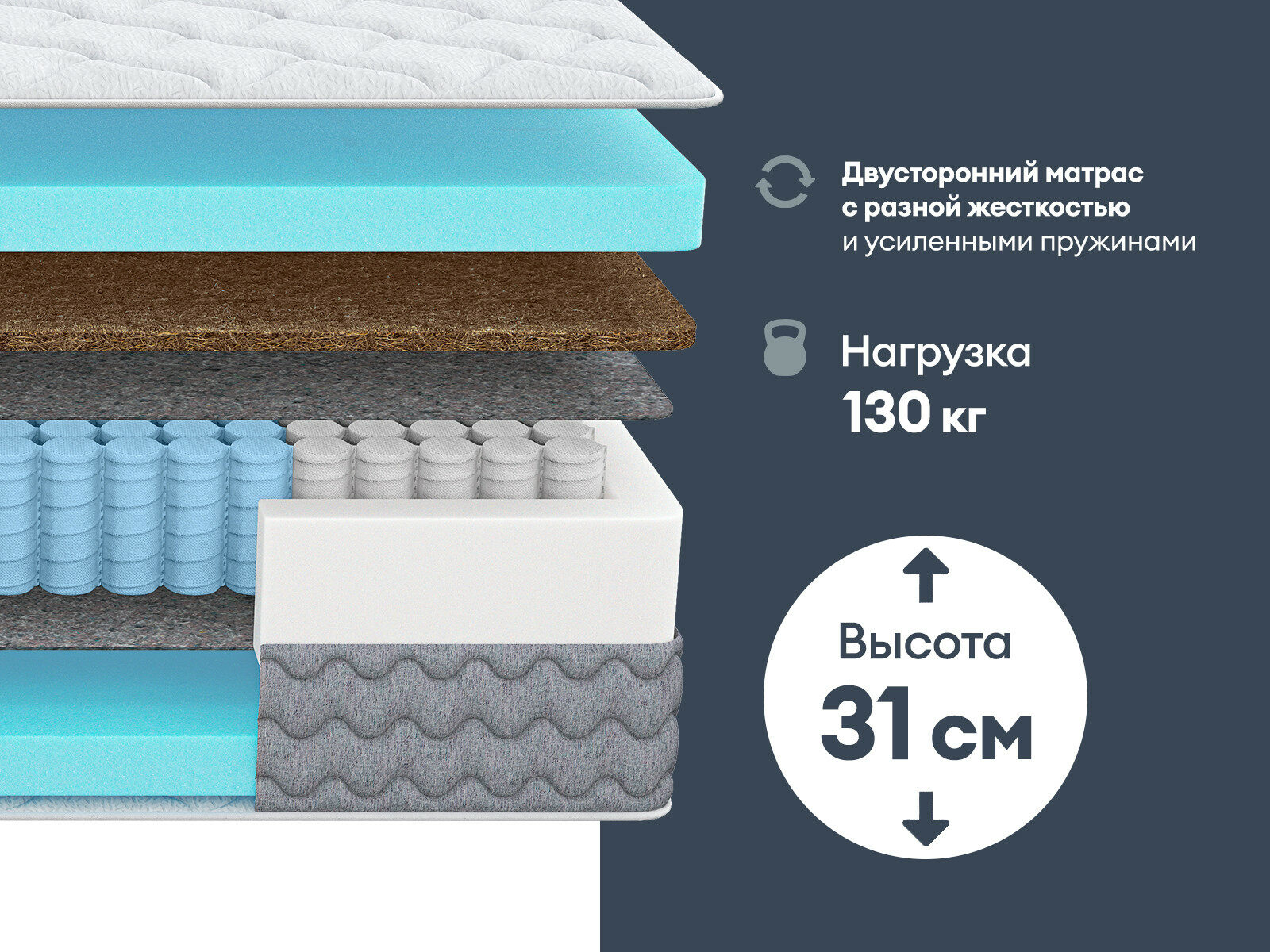 Это универсальное решение для обустройства спального места как в доме, так и на даче. Двухсторонняя жёсткость позволяет легко адаптировать матрас под индивидуальные предпочтения, обеспечивая комфорт и поддержку.