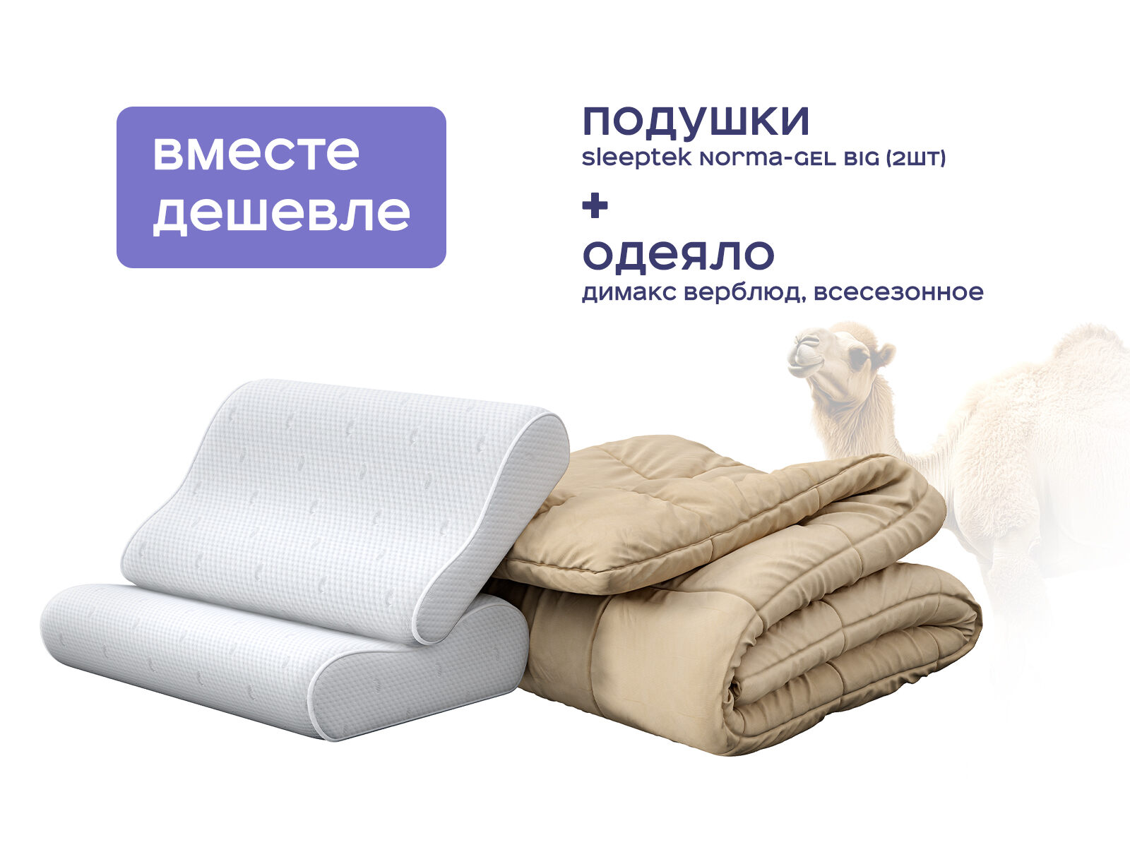 Комплект одеяло Димакс Верблюд всесезонное + подушка Sleeptek Norma-GEL BIG 2 шт. — симбиоз вековой природы и современных технологий для вашего идеального сна. Покупая набор, вы экономите до 39% и получаете одеяло из верблюжьей шерсти с уникальным климат-контролем и две анатомические подушки с усиленным охлаждением, которые вместе создают условия для восстановления сил и здоровья. Это комплект работает как личный оазис сна в одном решении.