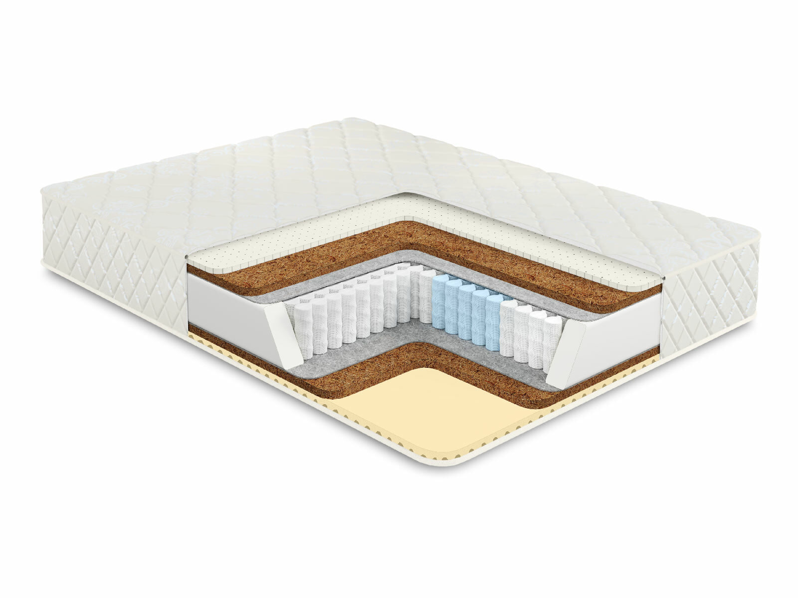 Пружинный матрас в основе которого многозональный независимый пружинный блок 1000 пружин на спальное место обеспечивает ортопедическую поддержку и комфорт во время сна. Независимые пружины подстраиваются под формы человека, потому что каждая пружина находится в отдельном кармашке и обеспечивает равномерное распределение веса;