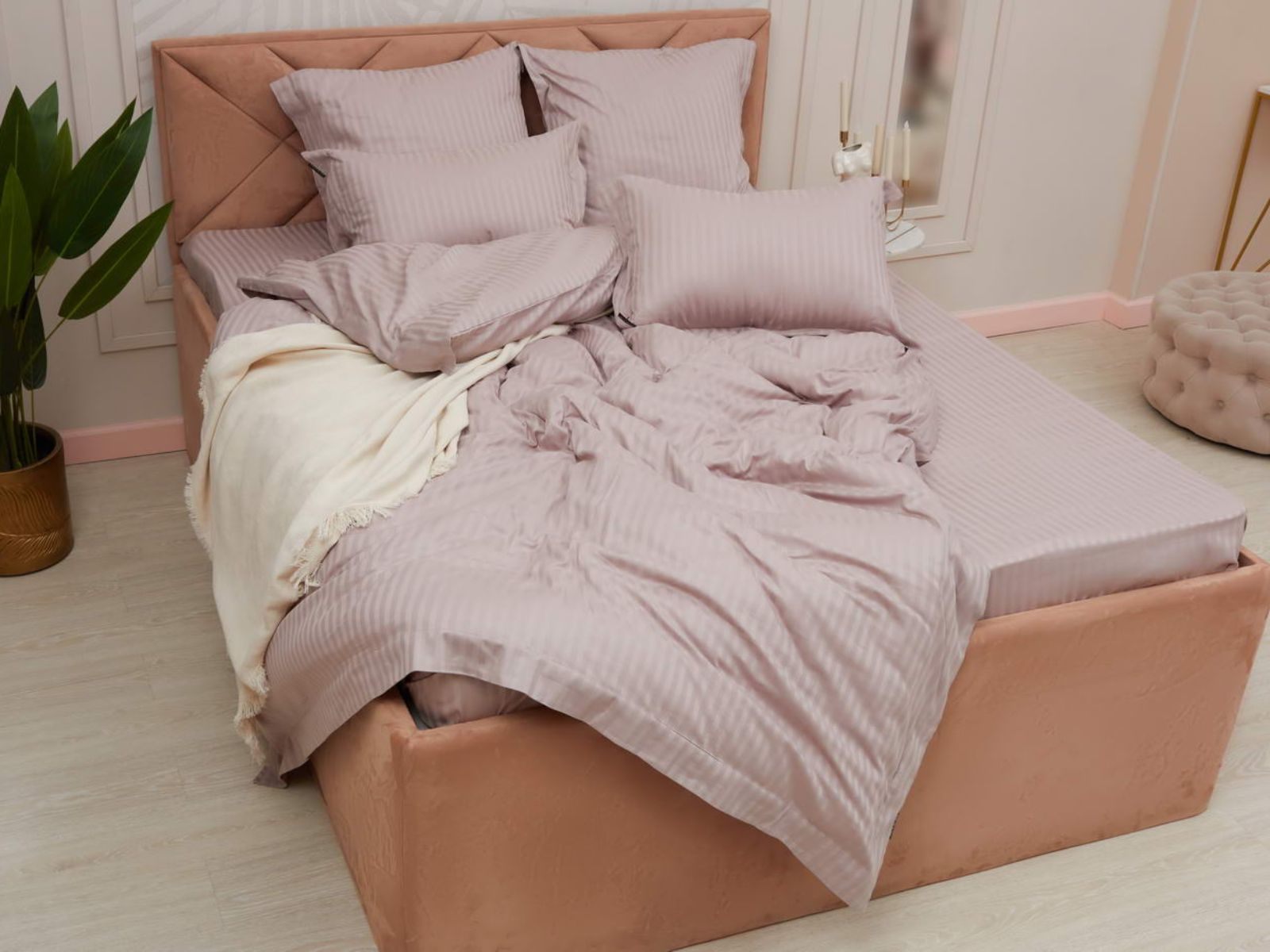 Постельное белье Моне, изготовленное из высококачественного страйп-сатина, станет украшением Вашей спальни. Комплекты представлены в 17 оттенках: от пастельных, до ярких насыщенных тонов. Такая палитра никого не оставит равнодушным. Особое плетение ткани образует узор в виде чередующихся полос, это придает постельному белью изысканность, гладкость и блеск.