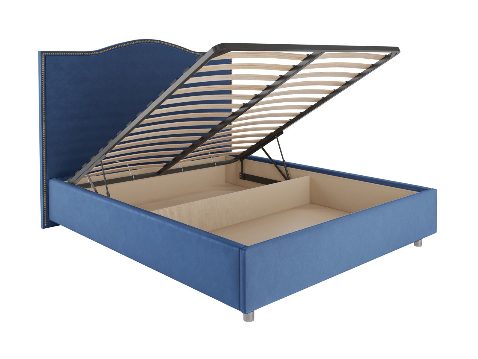 Кровать комплектуется металлическим основанием с подъемным механизмом, под которым находится вместительный бельевой ящик для хранения сезонных вещей и постельных принадлежностей.