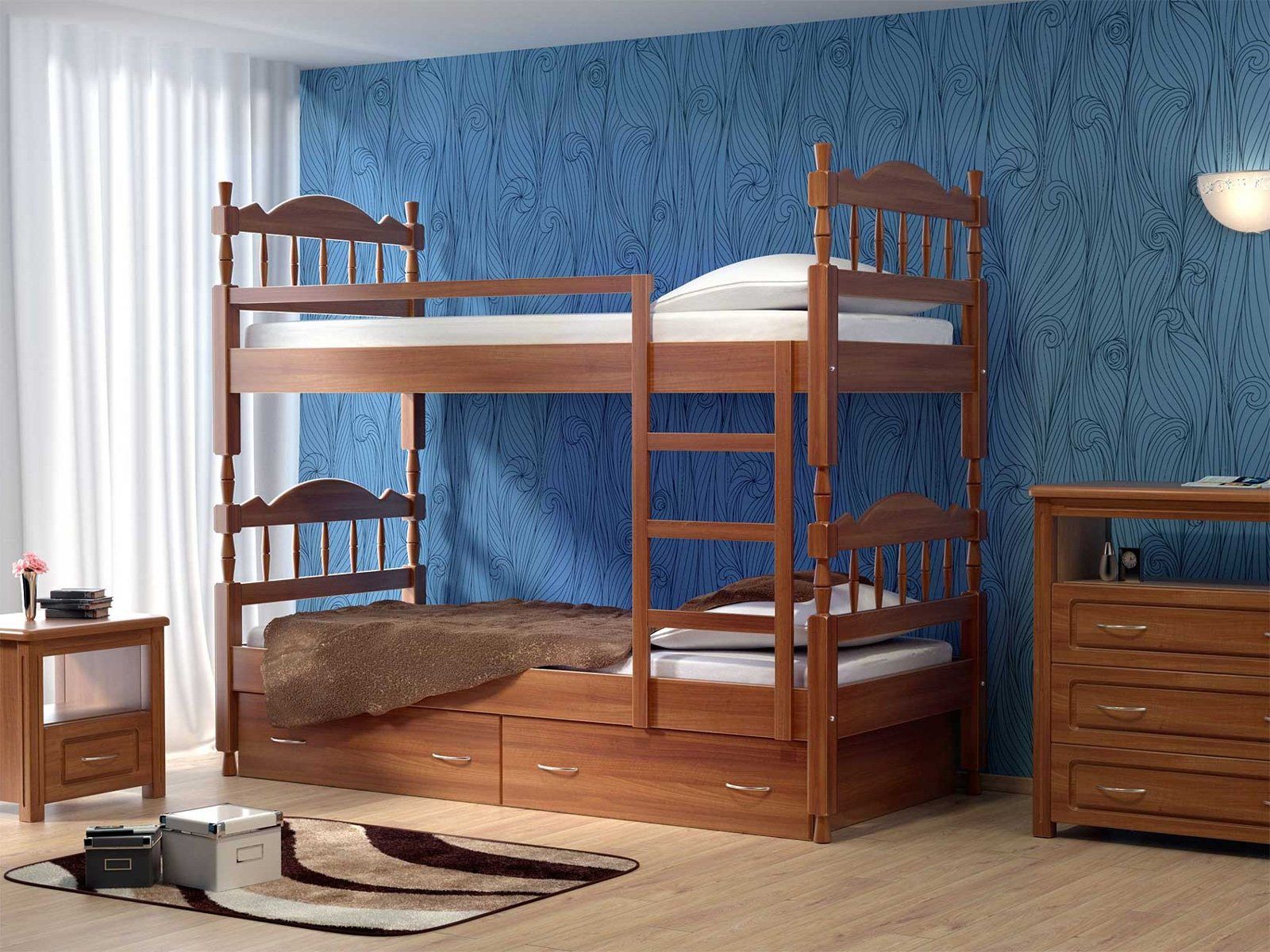 Удобная двухъярусная детская кровать с ящиками для хранения постельных принадлежностей и надежно закрепленной лестницей. Для обеспечения безопасности ребенка второй ярус оснащен бортиком-ограничителем, исключающим падение ребенка во время сна. Деревянная кровать из массива ясеня выполнена по индивидуальной технологии. Детская кровать подарит больше пространства и идеально впишется в интерьер детской комнаты. Вместительные встроенные ящики прекрасно позаботятся об игрушках и постельных принадлежностях. Кровать полностью выполнена из натурального дерева. Кровати из массива ценных пород дерева – гарантия экологической чистоты в Вашем доме.