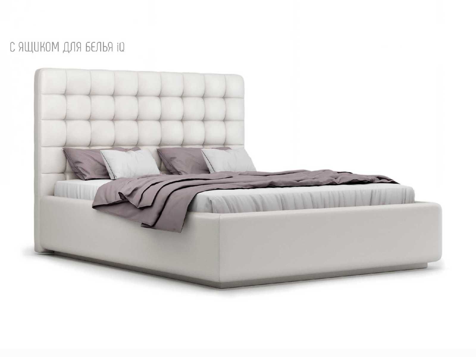 Кровать укомплектована IQ с подъемным механизмом и ящиком для белья без дна (дополнительная платная опция - дно к ящику IQ из HDF (ХДФ). Каркас кровати на цоколе, декоративный чехол на цоколе съёмный. Глубина ящика для белья - 30 см, без ограничения нагрузки на ящик.