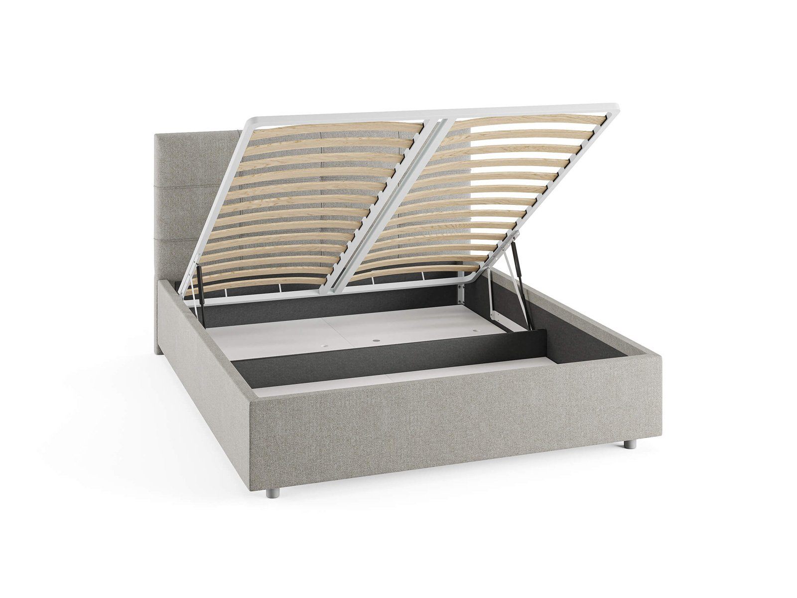 Кровать комплектуется металлическим основанием и подъемным механизмом со вместительным бельевым ящиком. Дно бельевого ящика легко сдвигается для обеспечения уборки под кроватью.