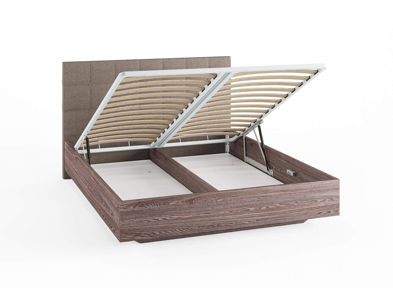 Кровать комплектуется металлическим основанием и подъемным механизмом со вместительным бельевым ящиком. Дно бельевого ящика легко сдвигается для обеспечения уборки под кроватью.