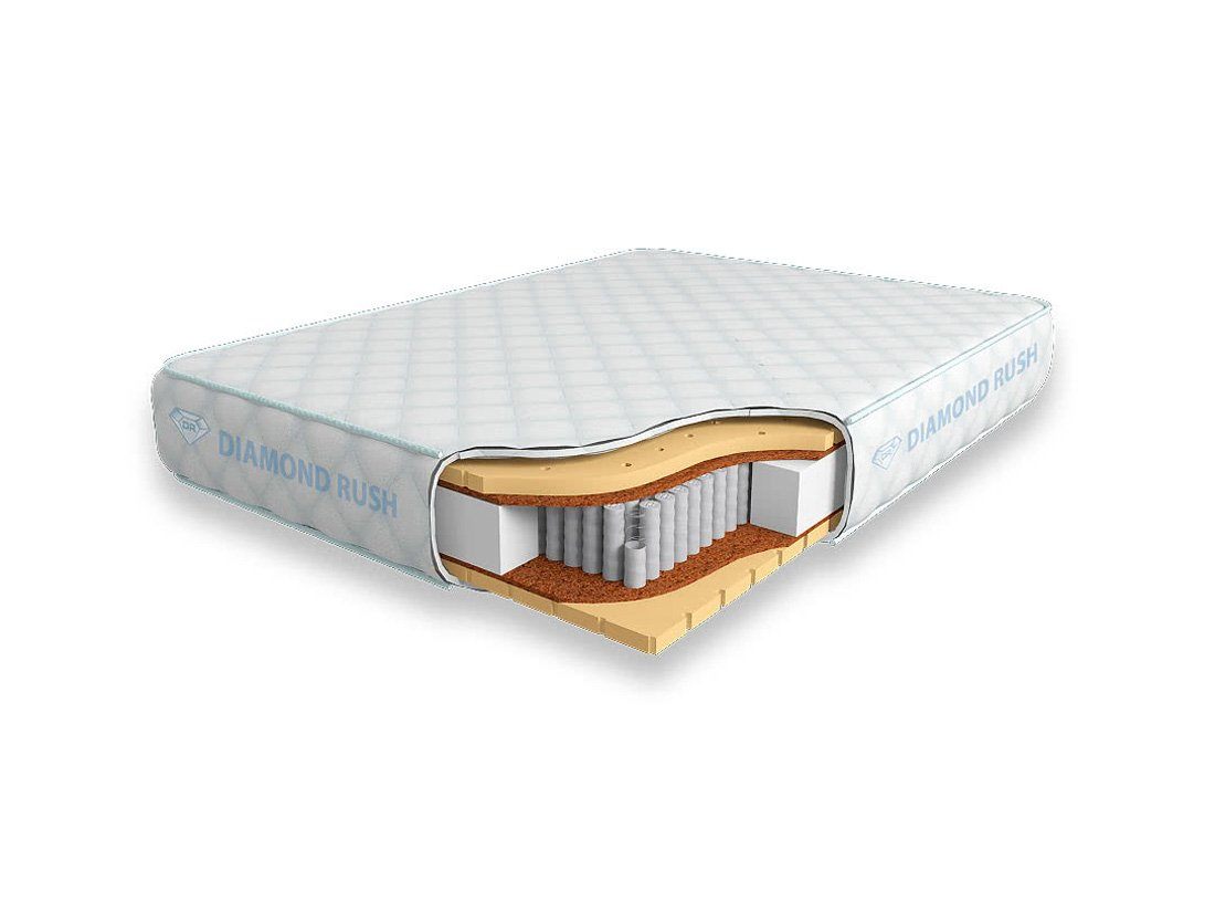 Матрас Diamond Rush Comfy 1440DR имеет в своей основе независимый пружинный блок 1440, состоящий из пружин диаметром 3-4 см. В качестве настилочных слоев поверх пружинного блока используются листы латексированной кокосовой койры, а также листовой перфорированный натуральный латекс. Стороны имеют одинаковую среднюю жесткость.
