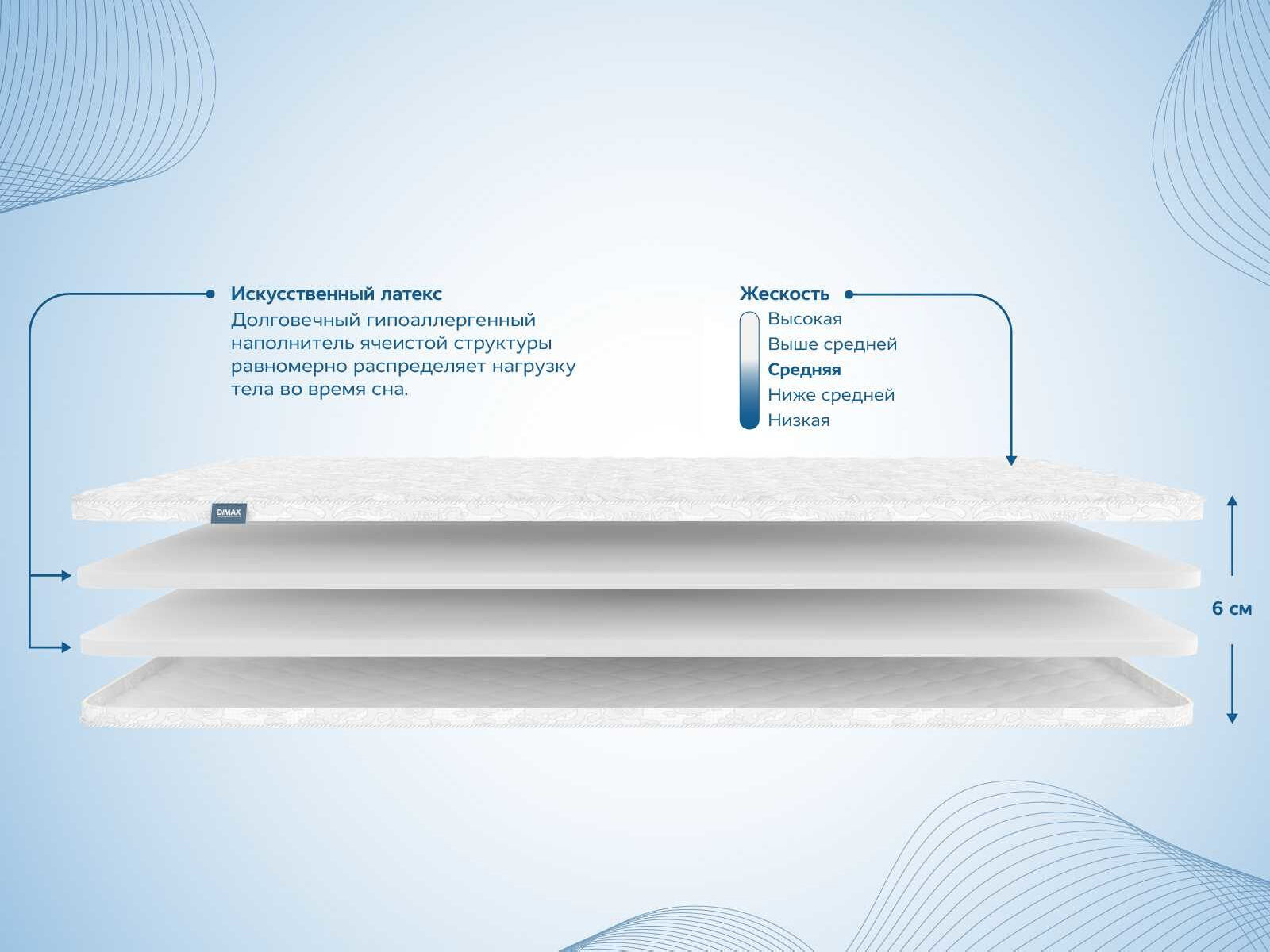 Димакс Искусственный латекс 6 см — практичный наматрасник для мгновенного комфорта и вашего удобства даже при сне на раскладной мебели. Искусственный латекс устраняет неровности, добавляет мягкости и продлевает срок службы спального места, сохраняя гипоаллергенность и воздухопроницаемость.