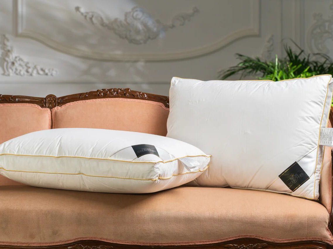 Ортопедическая трехкамерная подушка c бортиком Подушка Trois Couronnes Luxury Selection 3-chamber Goose Down MEDIUM белого цвета c золотым кантом.