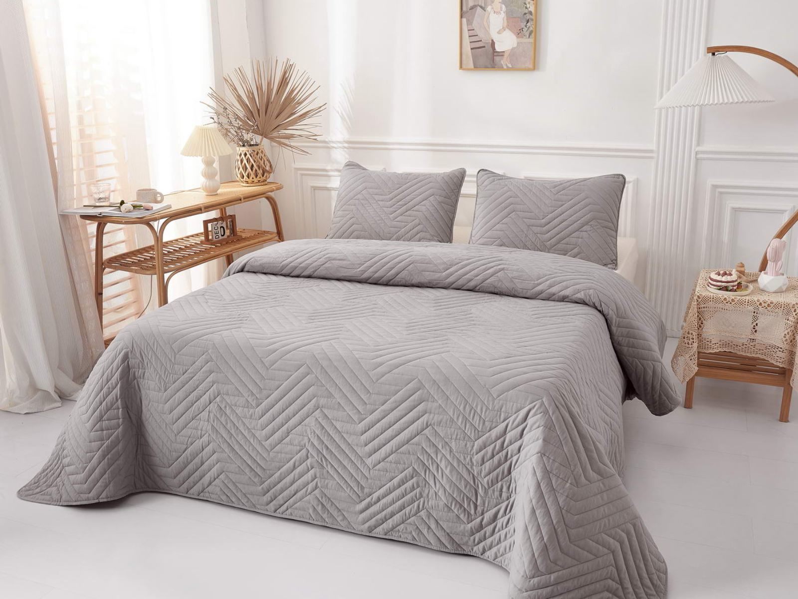 В комплект входят покрывало и одна либо две наволочки (50х70 см) из аналогичного материала в зависимости от размера. Изделия гипоаллергенны, они подходят детям и людям с чувствительной кожей. Покрывала и наволочки не линяют, сохраняют форму и цвет при многочисленных стирках и не выгорают на солнце. Изделия можно стирать в щадящем режиме при температуре не выше 30 градусов.