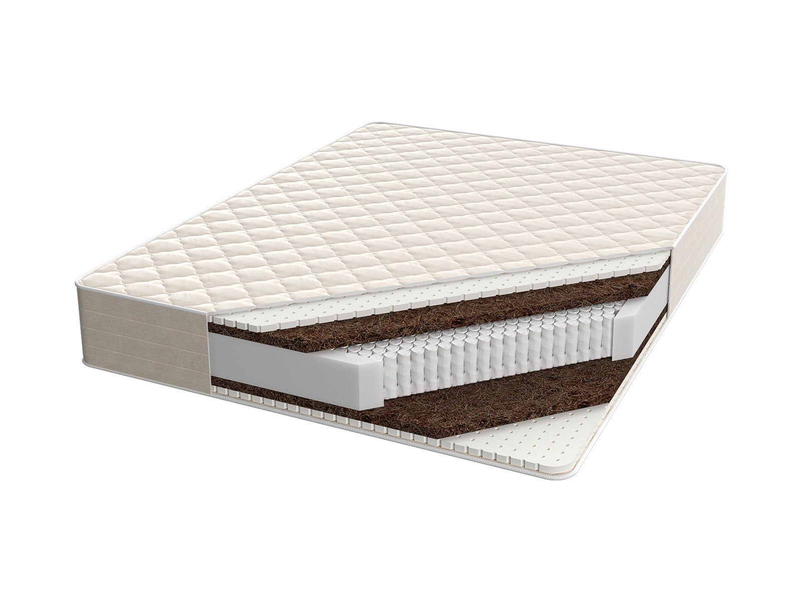 Пружины дополняются достаточно толстым, в 3 сантиметра толщиной, слоем кокосовой койры – это материал характеризуется не только твердостью, но и хорошей эластичностью. Если кокос и пружины обеспечивают жёсткость, необходимую для того, чтобы клиент с большим весом не «провалился» в кровать, а находился в здоровой, правильном положение, то 2-х сантиметровые слои латексной пены дают небольшую, но необходимую мягкость, прекрасно подходящую для уютного спального места.